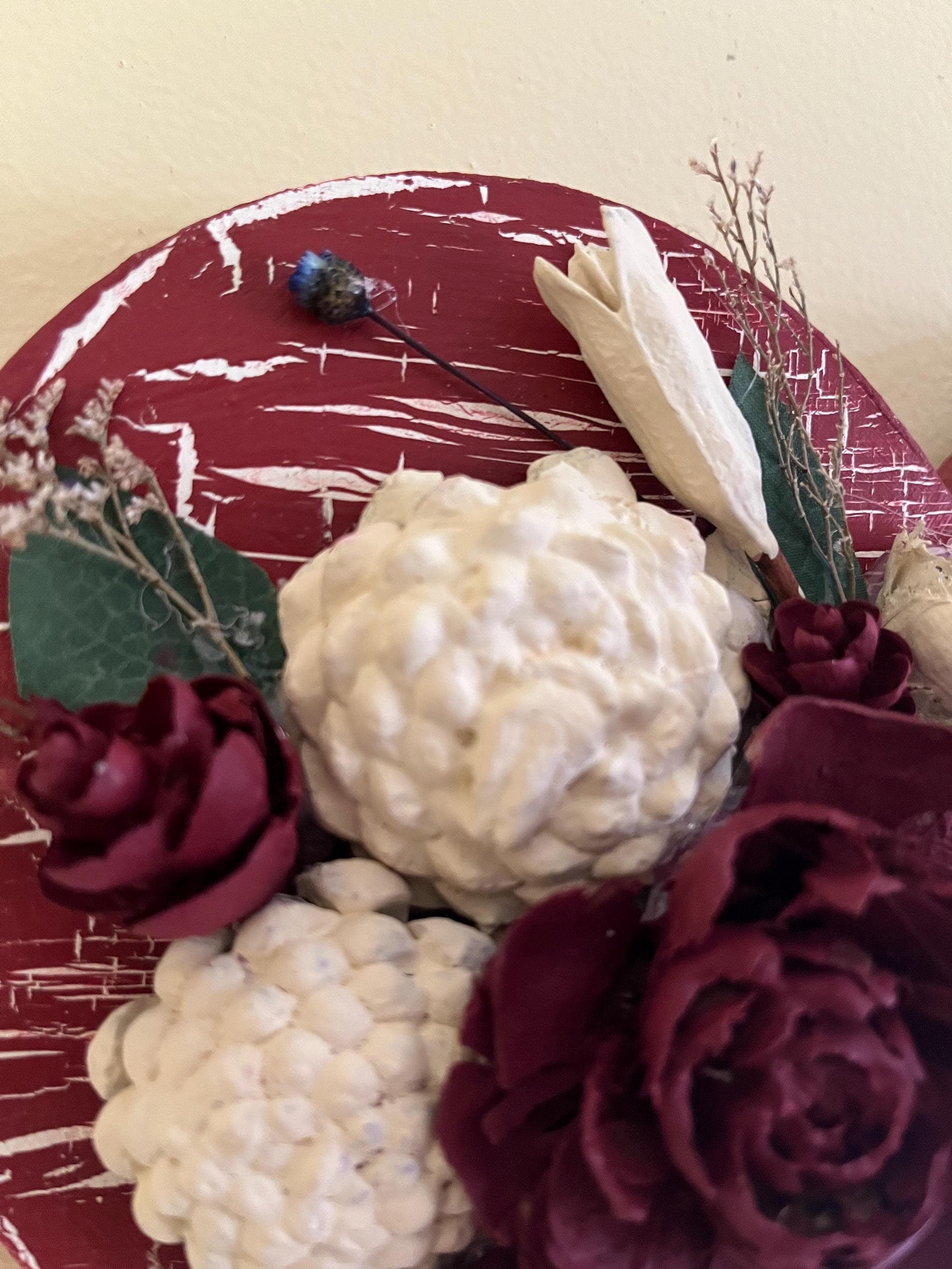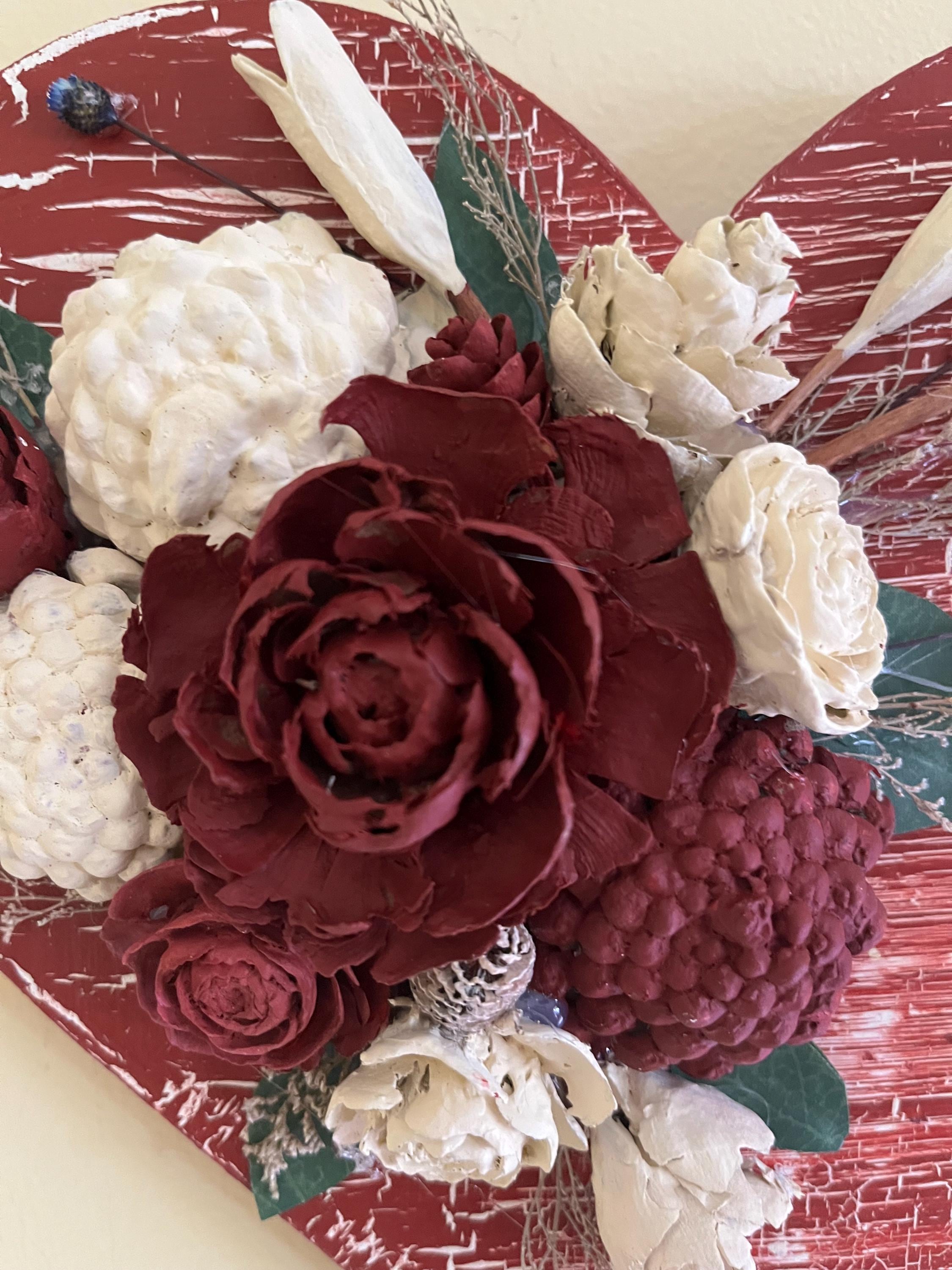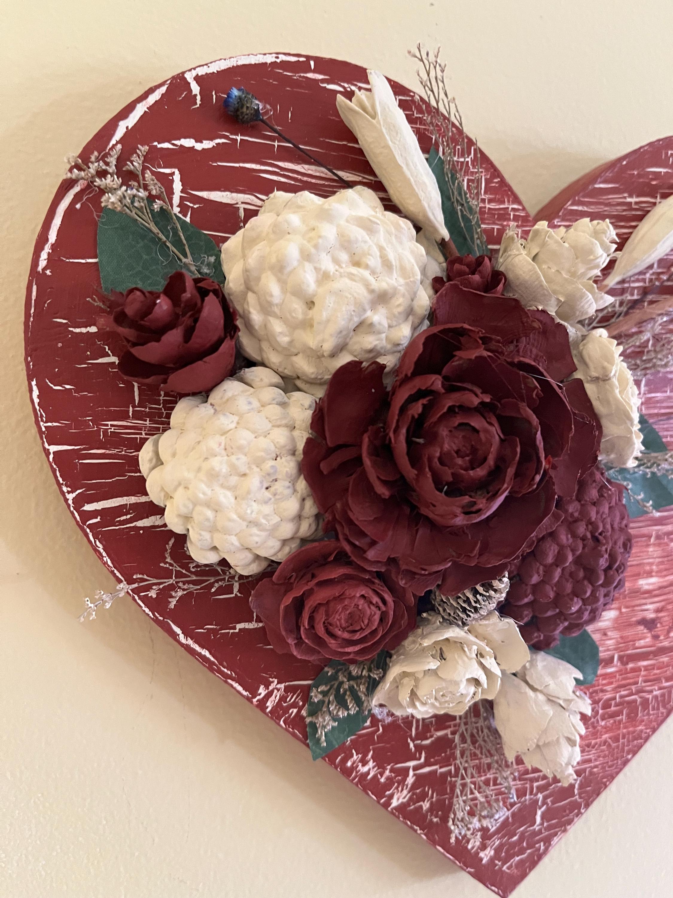 Each pinecone is individually shaped and painted to resemble delicate blooms, giving the piece beautiful texture and natural charm. The distressed crackle finish adds a vintage touch, making it perfect for Valentine’s Day, anniversaries, or year‑round romantic décor.