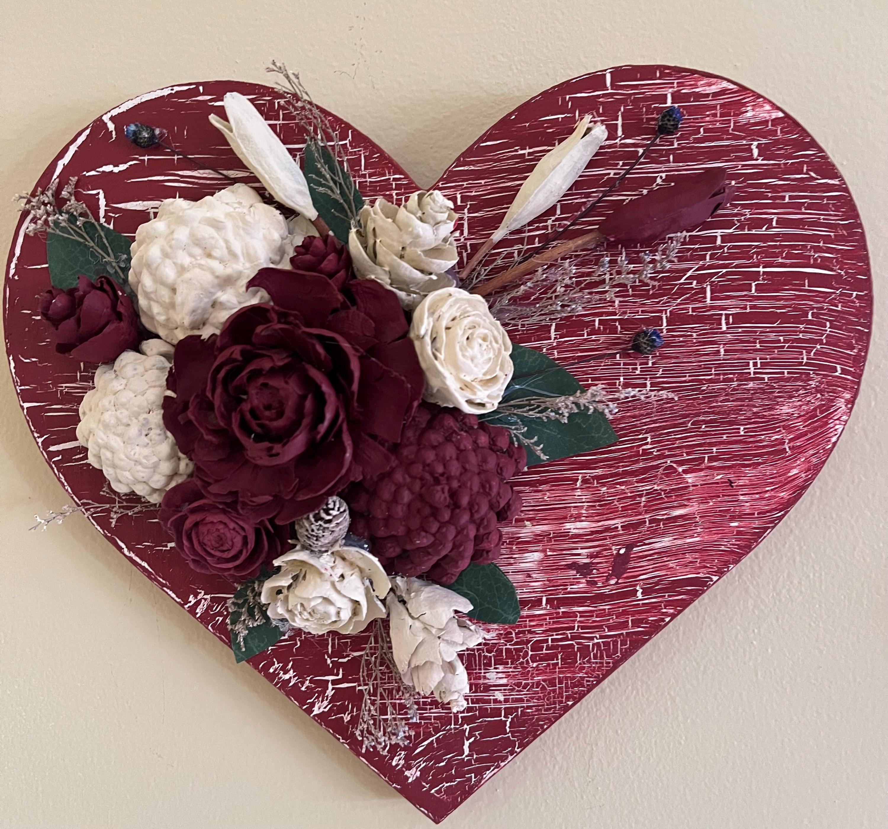 Celebrate love with a one‑of‑a‑kind rustic heart wall hanging, handcrafted with care in my West Coast studio. This charming piece features a **crackle‑painted wooden heart** in deep romantic red, paired with **hand‑painted pinecone flowers**, burgundy roses, antique‑white accents, and soft greenery for a warm, cottage‑style look.